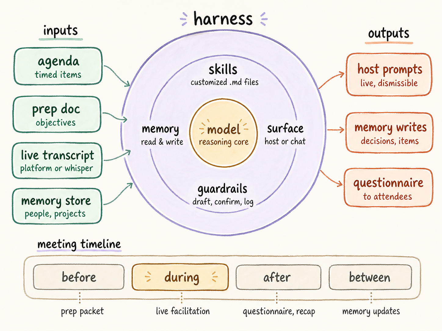 The agent itself is small. The reasoning core is just a model. What makes it actually facilitate is everything wrapped around it — the harness. The harness is what gives the model eyes (the live transcript), ears (the memory of past meetings), context (the agenda, the prep doc, the per-meeting facilitation objectives), hands (the ability to write back to memory and surface prompts to the host), and rules (the customizable skill files that define how it behaves).