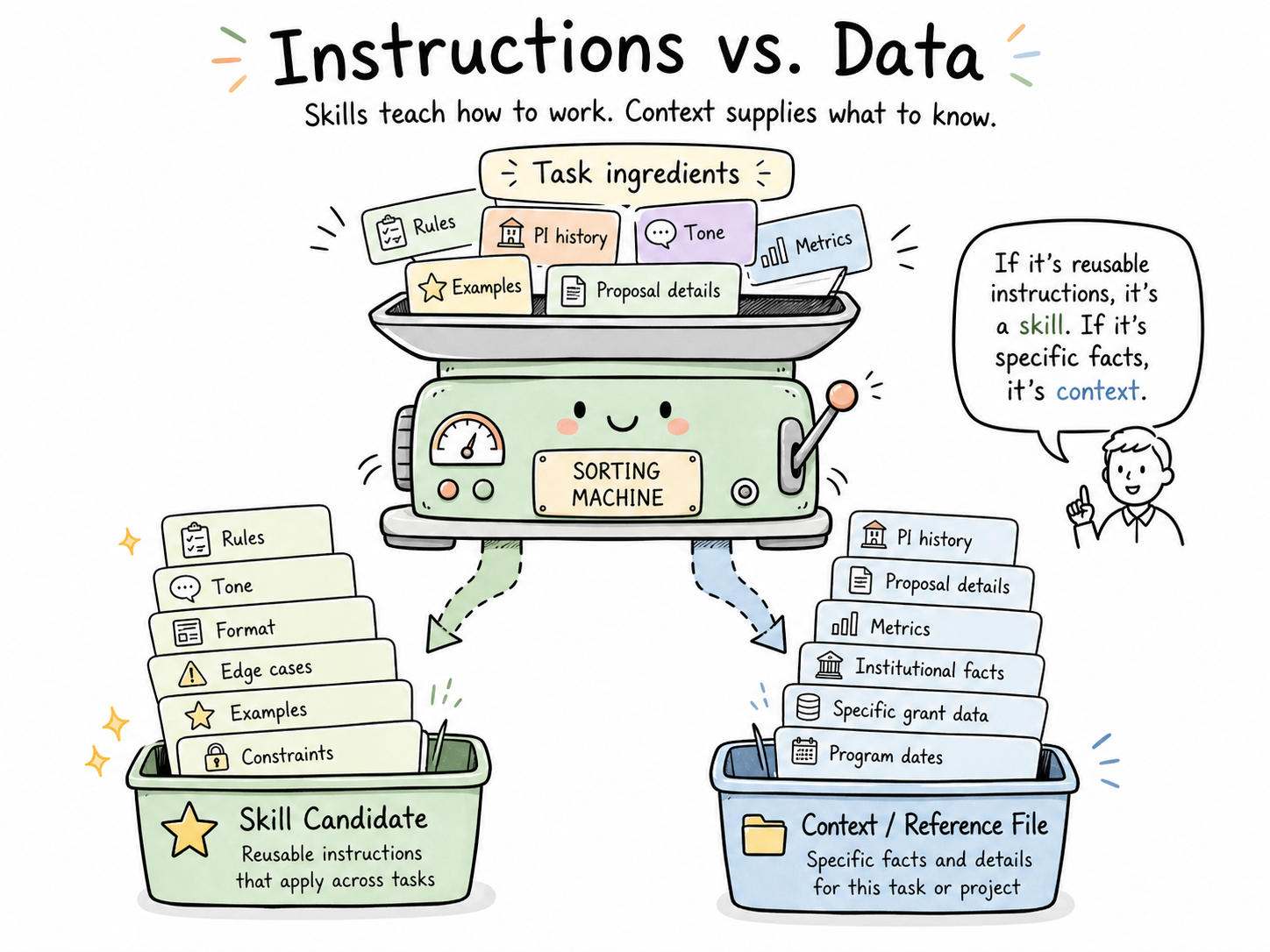 If the task is mostly about data — this specific PI's history, this specific proposal's contents, this specific training grant's metrics — it's not a skill. That's context, and context belongs in a portfolio of reference files, not in a skill.