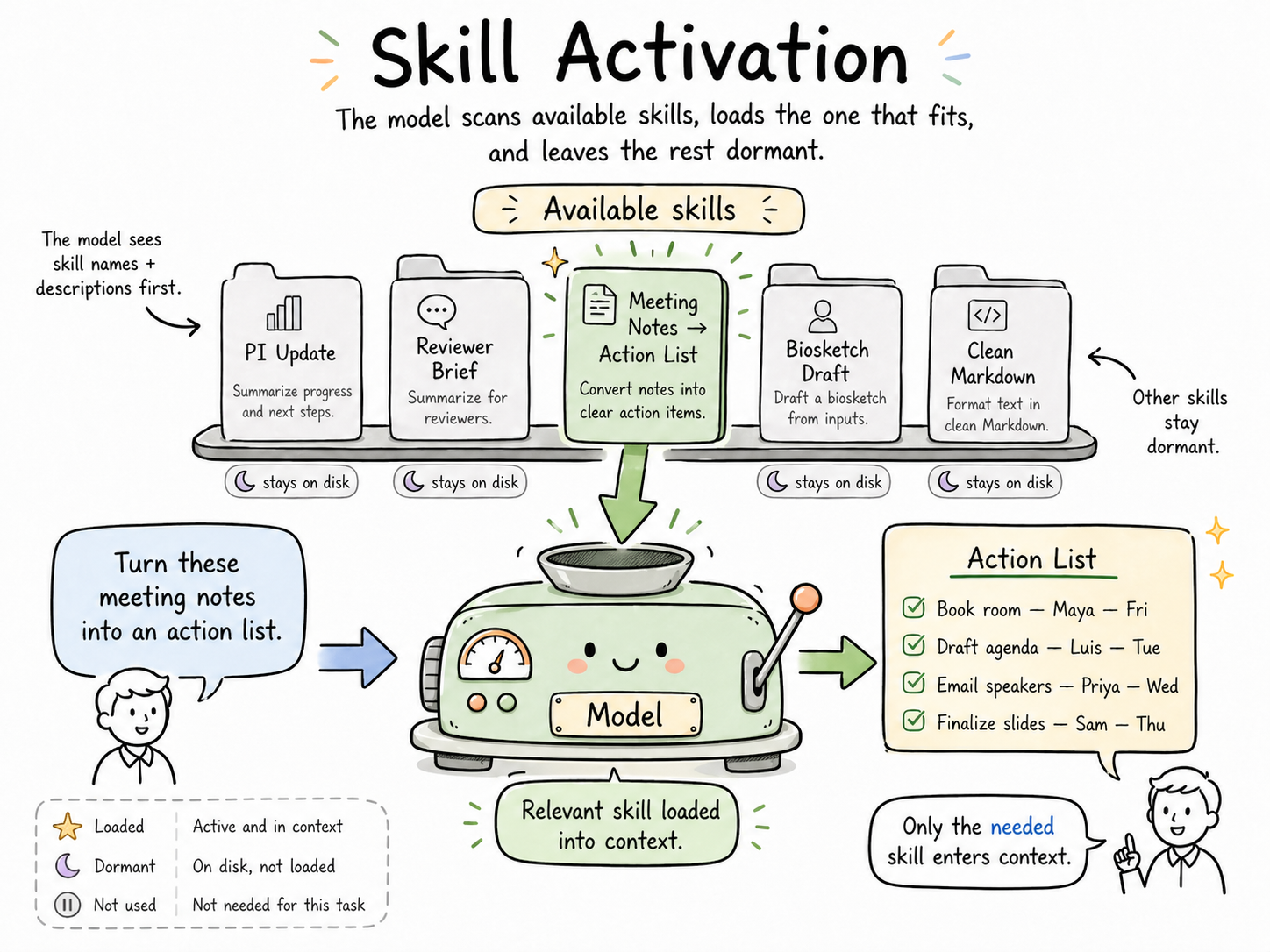 A skill is a markdown file that lives in a known location (on your machine, in your project folder, or in a repo). Each skill has a short description at the top — this is the only part the model sees by default. When you ask the model to do something, it scans those descriptions, decides which skill (if any) matches the task, and then pulls in the full skill file. Everything else stays on disk.