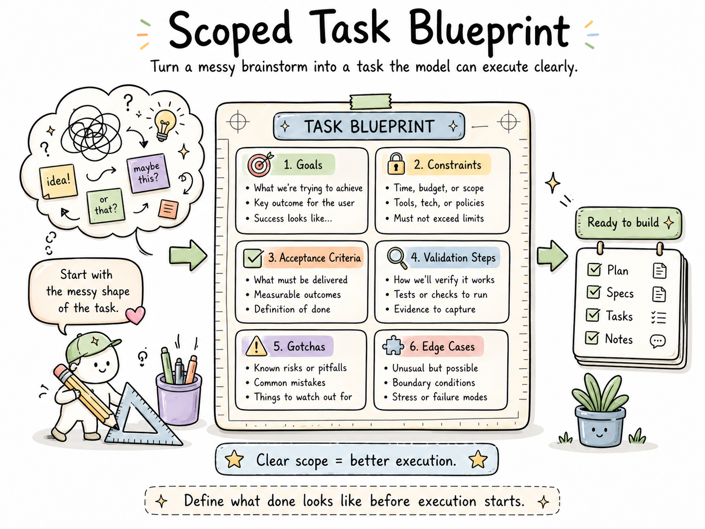 What I do: In Claude.ai or Cowork, convert my messy brainstorm into a clearly scoped task with: