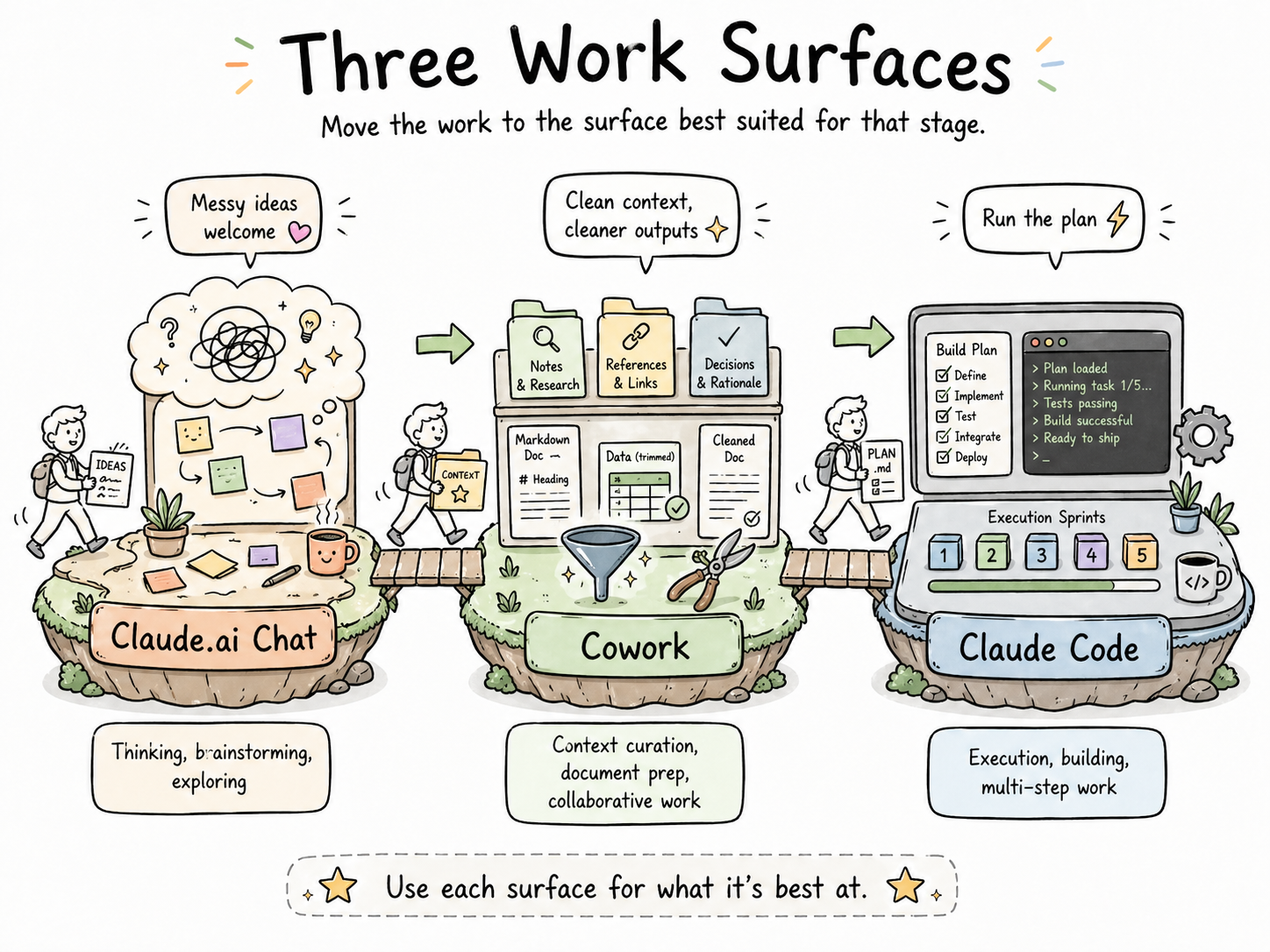 | Claude.ai (web chat) | Thinking, brainstorming, exploring | Low-stakes, conversational, fast to iterate |